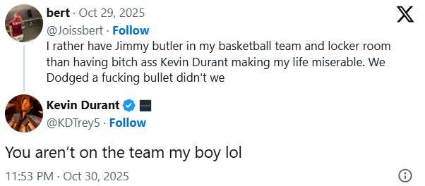 昨日有一位球迷声称勇士队没有交易得到杜兰特是“躲过了一劫”,这位休斯顿火箭队的球星在社交媒体上进行了回击。球迷写道:“我宁愿让巴特勒来我主队并加入我主队的更衣室,如果换成杜兰特这会让我感到生不如死,我们tmd躲过一劫啊。”