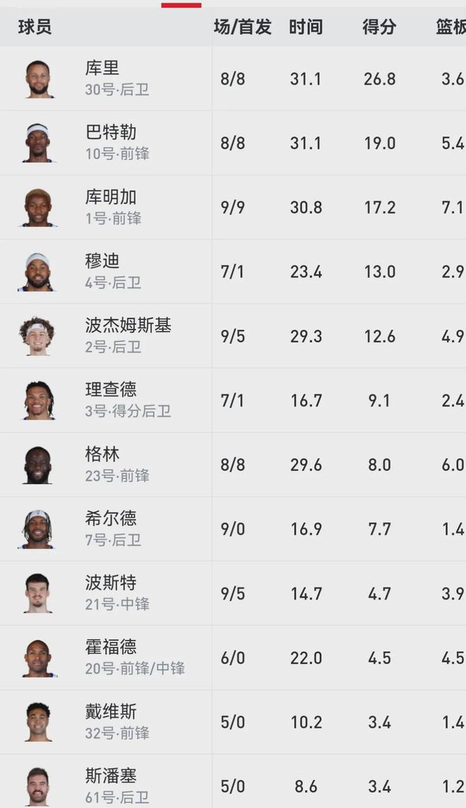 其实勇士(5胜4负,西部第七)在伤病管理这块,在当今联盟已是优等生的存在,将核心成员的出场时间都控制在30分钟左右,无奈像库里(37岁)和巴特勒(36岁)这样的老将终究还是太老了,随着赛程深入身体就会难免出现一些毛病,“老龄化”严重是他们冲冠的最大障碍。