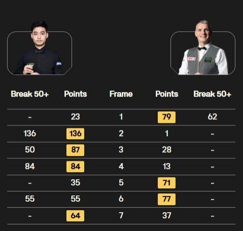 斯诺克苏格兰公开赛64进32轮次,斯佳辉4比3马克·戴维斯晋级32强。斯佳辉打出一杆破百(136)和三杆50+(88、74、55),马克·戴维斯打出单杆62分,双方战至决胜局,斯佳辉以4比3的比分战胜马克·戴维斯晋级32强。